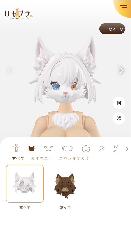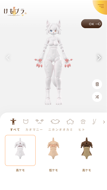 この製品はケモ度順に「低ケモ」「中ケモ」「高ケモ」のパーツがあり、自由に組み合わせて自分好みのキャラクターに仕上げることができます。