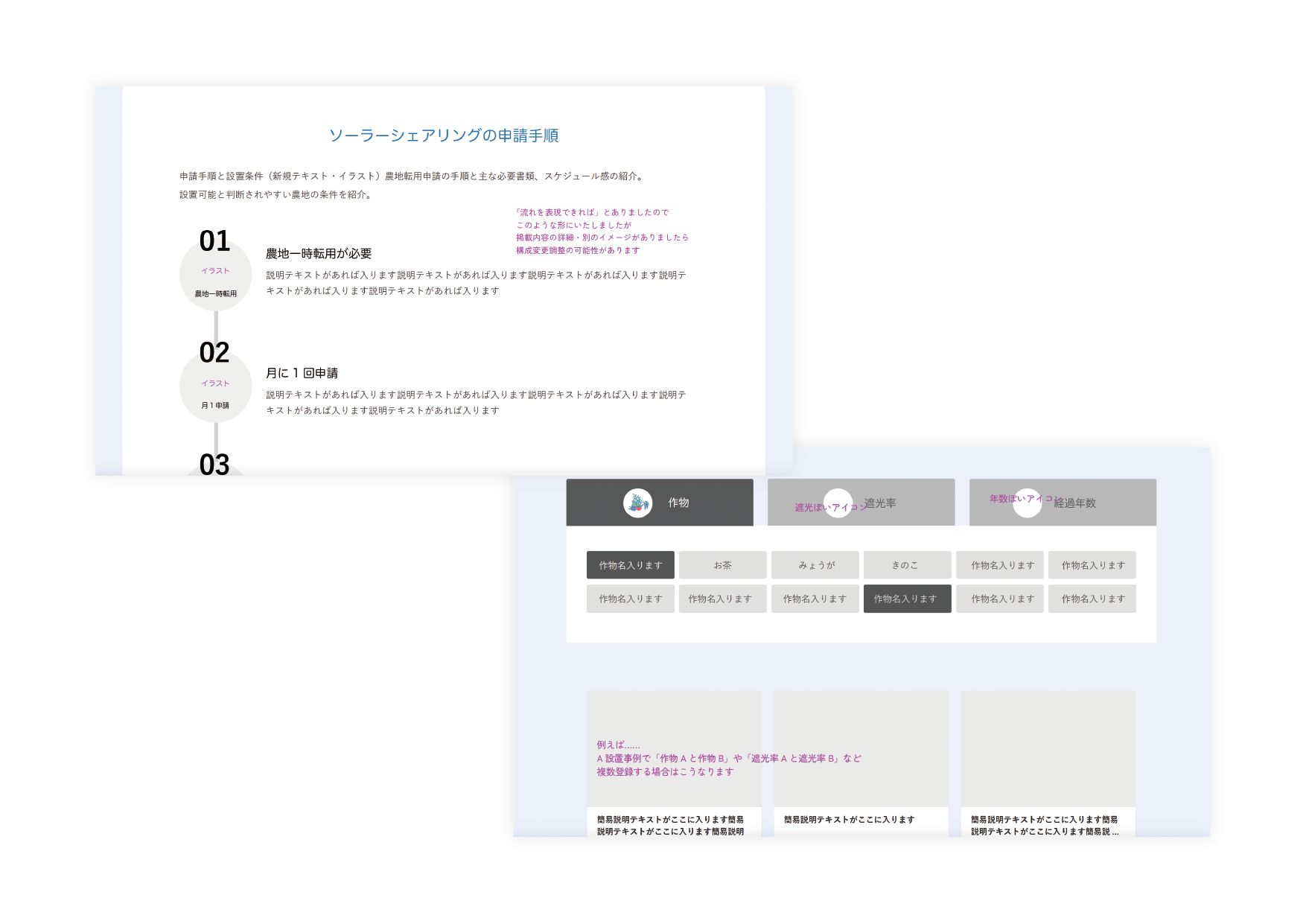 例えば、ソーラーシェアリングの説明ページは、文章で伝える情報量が多い分、どうしてもテキストだけだと読みにくくなってしまうのではないかと感じていました。